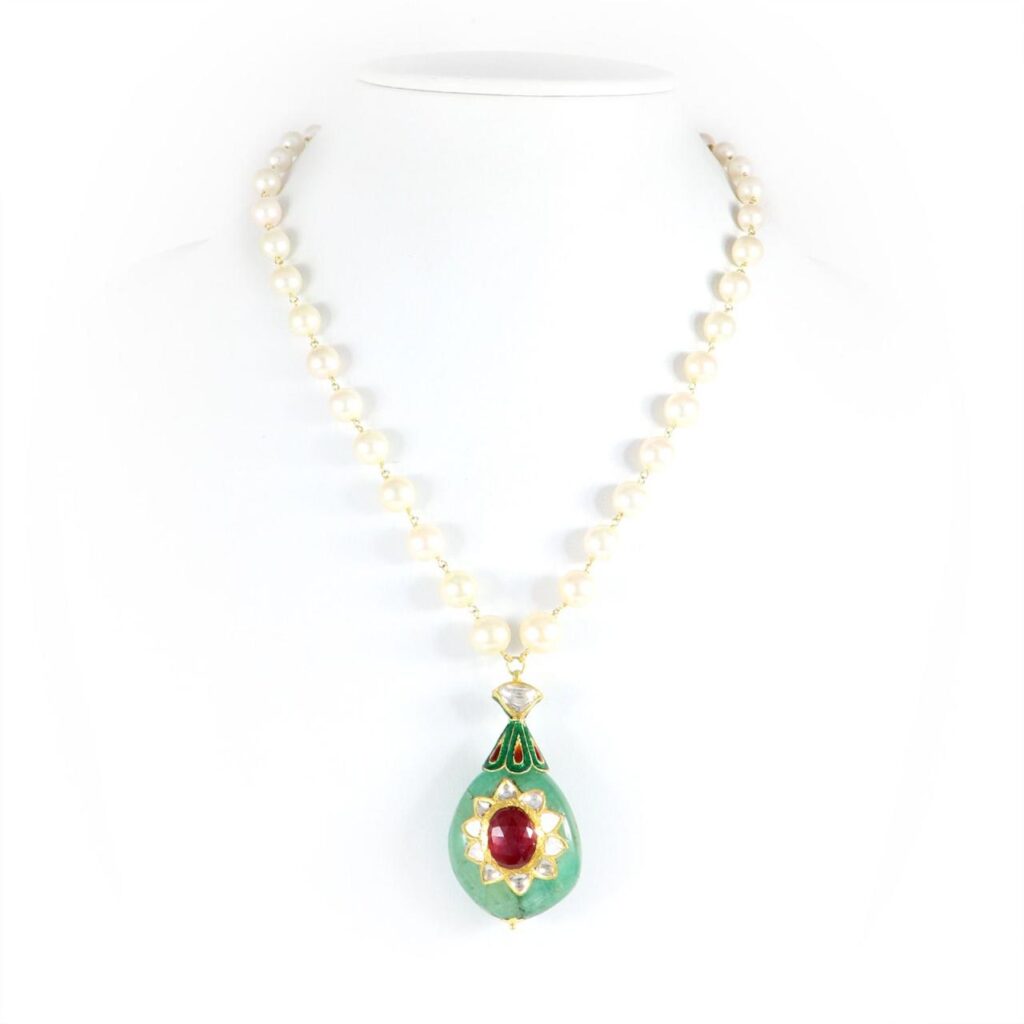 Moreover, smooth contours of pearls and polished crystal surfaces create a graceful flow along the neckline. They provide a balanced, visually refined appearance.
